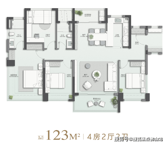 最小户型是123㎡,LDKG一体化布局,南北双阳台,U型厨房,烹饪动线合理,主卧同样带270°转角飘窗和独立衣帽间。