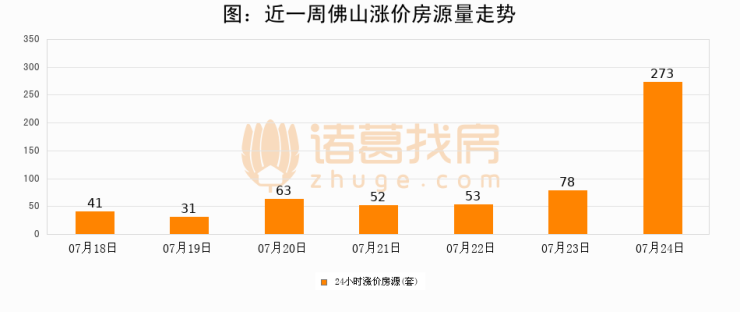 根据诸葛找房数据显示,佛山24小时涨价房源量为273套,较07月23日增加195套,环比上涨250%。与此同时,涨价房源占比小幅扩大,业主信心有所提升。