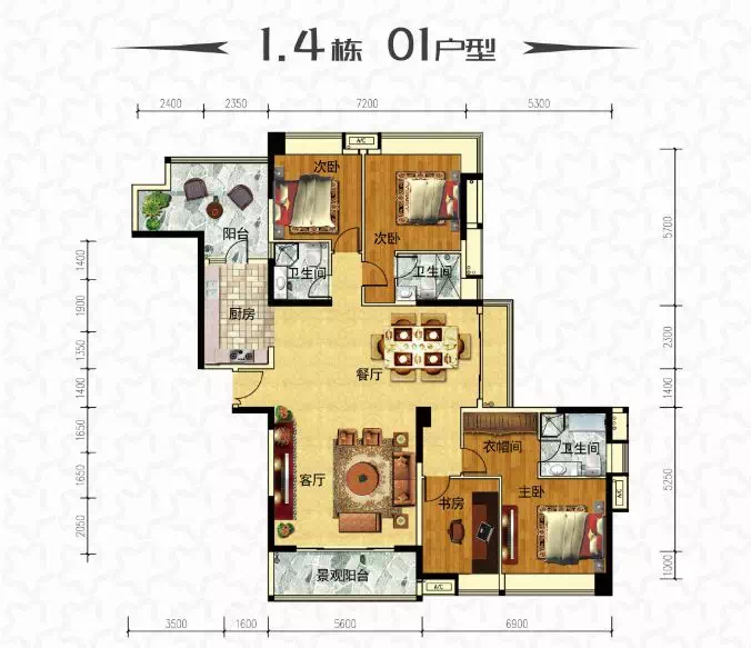 四房两厅三卫,五开间朝南,三面采光,5.6米观景阳台,长达10米的客餐厅横向开间……这些点整合起来,整个户型都显得非常得大气,并且采光观景都优质。