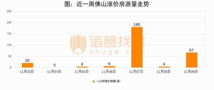 根据诸葛找房数据显示,佛山24小时涨价房源量为67套,较11月08日增加63套,环比上涨1575%。与此同时,涨价房源占比小幅扩大,业主信心有所提升。