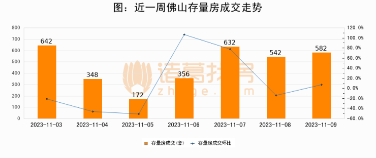 从存量房来看,2023年11月09日佛山存量房单日成交582套,比昨日增加40套,环比上涨7.4%。从近一周存量房成交来看,佛山存量房日均成交套数为467套,11月09日单日成交582套,高于近一周平均水平24.6%。