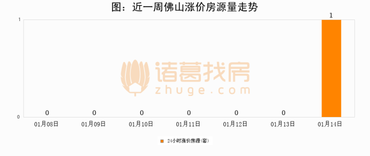 根据诸葛找房数据显示,佛山24小时涨价房源量为1套,较01月13日增加1套,环比上涨0%。与此同时,涨价房源占比小幅扩大,业主信心有所提升。