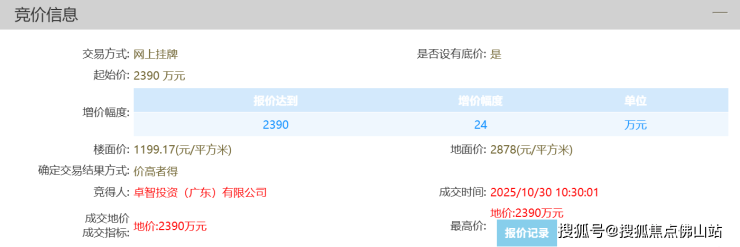 10月30日,卓智投资(广东)有限公司以底价2390万元夺得西樵一宗商服地,折合楼面价1199.17元/㎡。