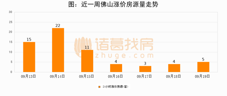 根据诸葛找房数据显示,佛山24小时涨价房源量为5套,较09月18日增加1套,环比上涨25%。与此同时,涨价房源占比小幅扩大,业主信心有所提升。