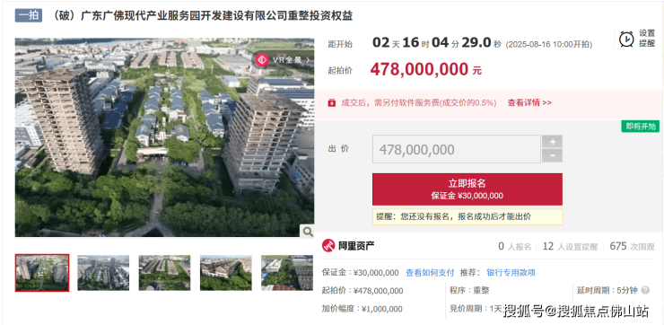 近日,阿里资产平台显示,广东广佛现代产业服务园开发建设有限公司重整投资权益将于8月16日开拍,起拍价为4.78亿。