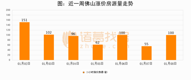 根据诸葛找房数据显示,佛山24小时涨价房源量为100套,较01月07日增加45套,环比上涨81.8%。与此同时,涨价房源占比小幅扩大,业主信心有所提升。