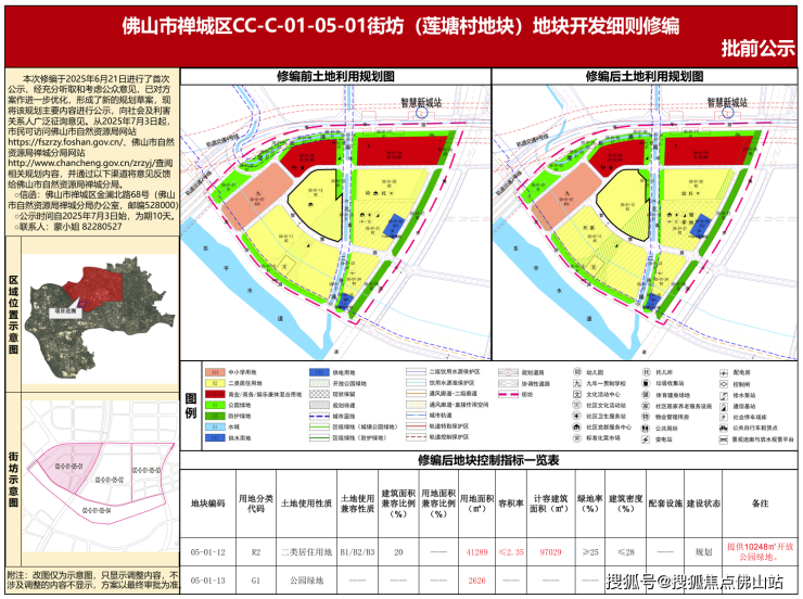 7月2日,禅城区政府网站发布关于再次进行《佛山市禅城区CC-C-01-05-01街坊(莲塘村地块)地块开发细则修编》公示的通告。