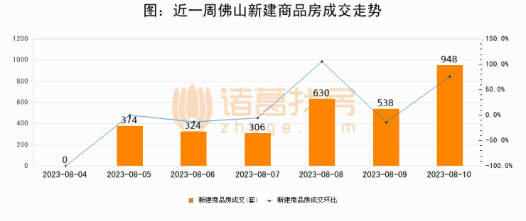 根据佛山市住房保障和房产信息网数据显示,2023年08月10日佛山新建商品房成交948套,较昨日增加410套,环比上涨76.2%