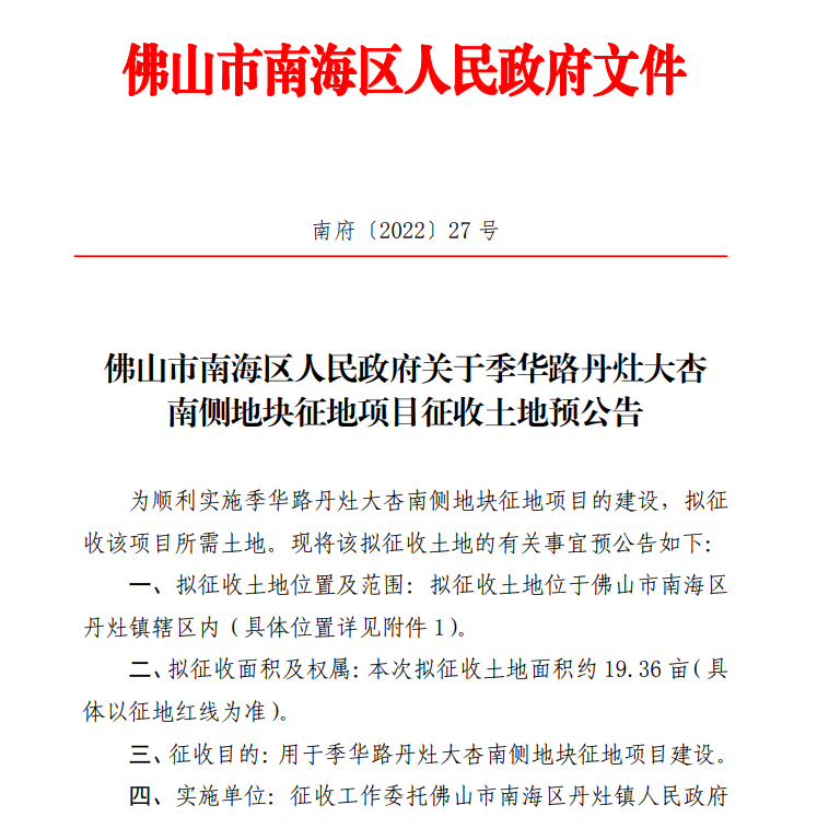 近日,搜狐焦点佛山站从南海区政府官网处获悉,南海区人民政府发布了《关于季华路丹灶大杏南侧地块征地项目征收土地预公告》,拟征收南海区丹灶镇辖区内约19.36亩(约12906.7㎡)的土地,公告期至3月28日。