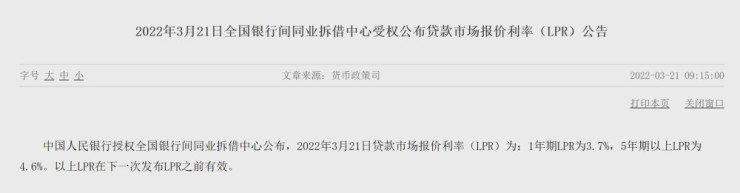 中国人民银行授权全国银行间同业拆借中心公布,2022年3月21日贷款市场报价利率(LPR)为:1年期LPR为3.7%,5年期以上LPR为4.6%,均较2月持平。