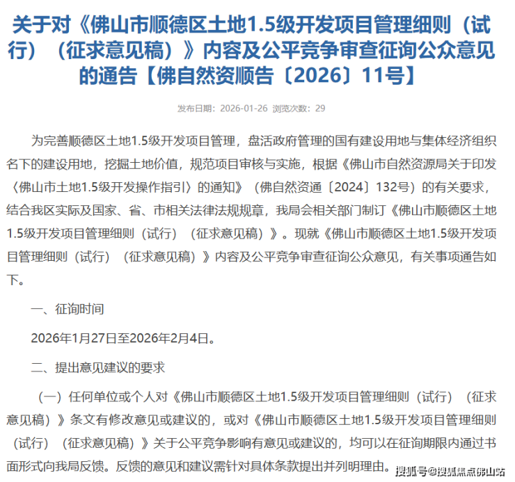 近日,佛山市自然资源局顺德分局发布关于对《佛山市顺德区土地1.5级开发项目管理细则(试行)(征求意见稿)》内容及公平竞争审查征询公众意见的通告。