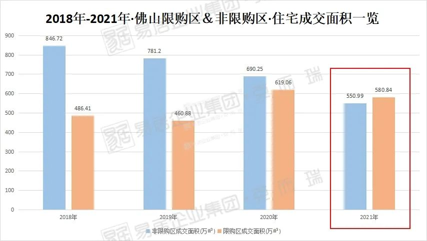 值得一提的是,近几年,佛山非限购区住宅成交不畅,年成交面积逐年下滑,由2018年的846.72万㎡下滑至去年的550.99万㎡。