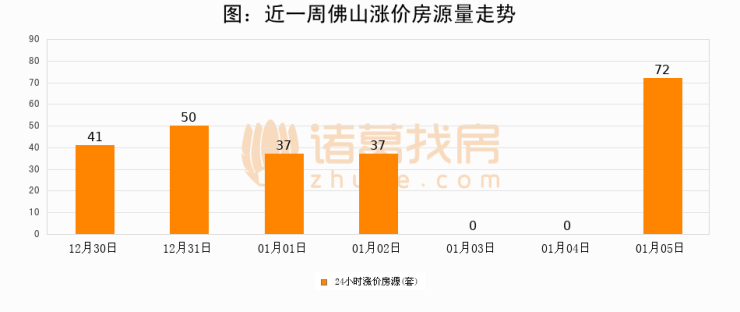 根据诸葛找房数据显示,佛山24小时涨价房源量为72套,较01月04日增加72套,环比上涨0%。与此同时,涨价房源占比小幅扩大,业主信心有所提升。