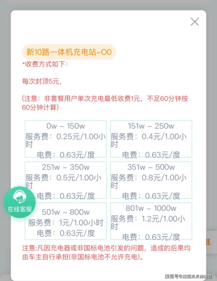 该品牌的部分站点有标明收费标准,且注明“该充电区仅限400瓦功率以下充电,大功率及非标改装车辆禁止充电”。