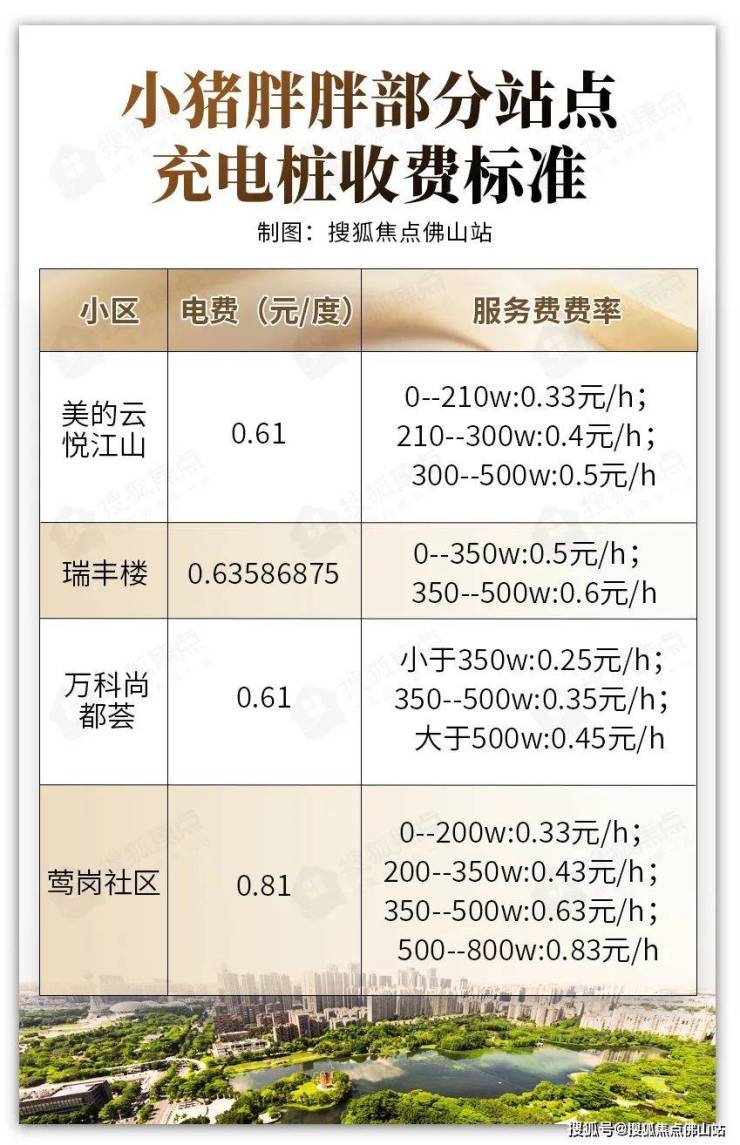 以小猪胖胖加电站为例,位于桂城的万科尚都荟,电费为0.61元/度,服务费则分3个档次,每小时最低0.25元、最高0.45元。