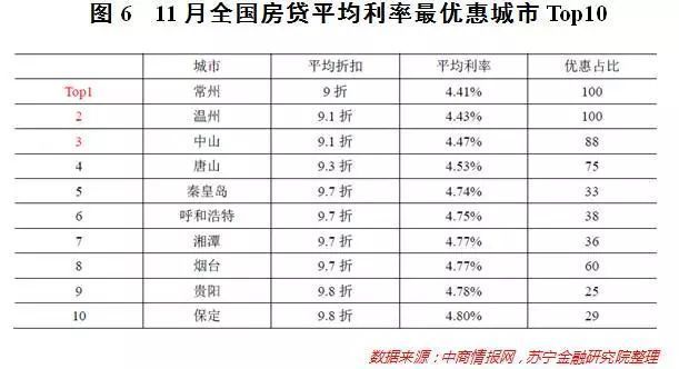 排名前列,利率折扣仍旧很低的城市或地区值得重点关注。虽说整体上看,贷款利率的上调已是不争的事实,但这毕竟是平均贷款利率的上调,并不排除一些城市依旧具有较低的利率水平。从2017年11月份统计数据来看,常州、温州、中山等十个城市的房贷平均利率最为优惠(见图6),这对于有购房需求的人来说无疑是一大利好:贷款利率折扣较低,也就意味着当地房价还没有见顶——至少不会出现人家都是基准利率,而你买房的时候却成了1.5倍基准利率的窘况。当然,意见仅供参考,切勿盲从。
