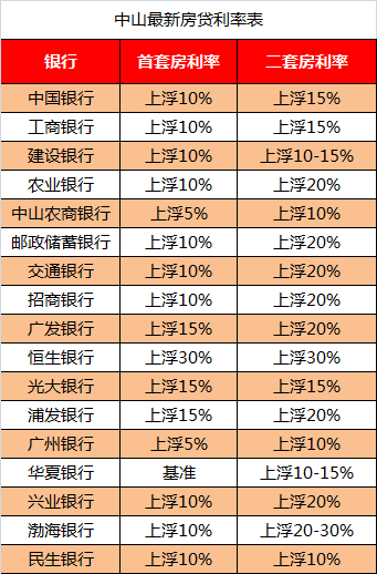 中山:首套上浮10%,二套较高上浮30%