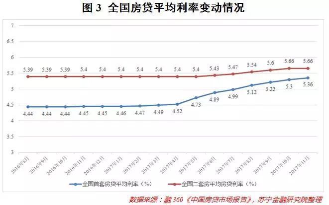 根据融360每个月定期发布的《中国房贷市场报告》中的监测数据(见图3),自2017年1月开始,全国首套房贷的平均利率已经实现了连续11个月的上涨,11月份更是高达5.36%,相当于基准利率的1.09倍,同比2016年11月上升逾20%。该利率尚且是首套房贷的平均利率,其中还包括了部分4.9%的便宜贷款,这便意味着,有些城市的首套房贷利率早已远超1.2倍的标准。至于二套房的房贷利率,更是始终居高不下,2017年11月份高达5.66%。于是我们可以大体判断,未来短期内,贷款利率的持续走高必将会导致房价的进一步下跌。