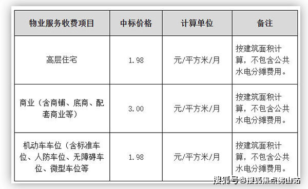 中标结果显示,高层住宅物业费为1.98元/㎡·月,商业为3元/㎡·月,机动车车位为1.98元/㎡·月。