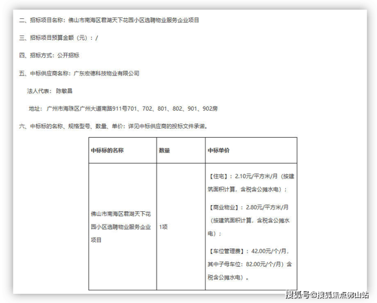 中标单价均包含税、公摊水电,其中住宅物业费为2.1元/㎡·月,商业物业费2.8元/㎡·月,车位管理费42元/个·月,子母车位为82元/个·月。