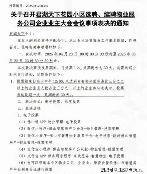 会议内容涉及表决是否同意续聘原物业服务公司、是否同意《南海区君湖天下小区物业服务合同》表决稿等,表决投票周期为期一个月。