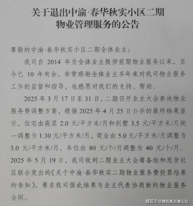 按照退场函要求,原物业的物业服务则于2025年7月31日正式终止,并提前与新聘请物业公司完成交接工作、撤离管理人员,并移交所有服务终止日后的已预收费用金额和清单。