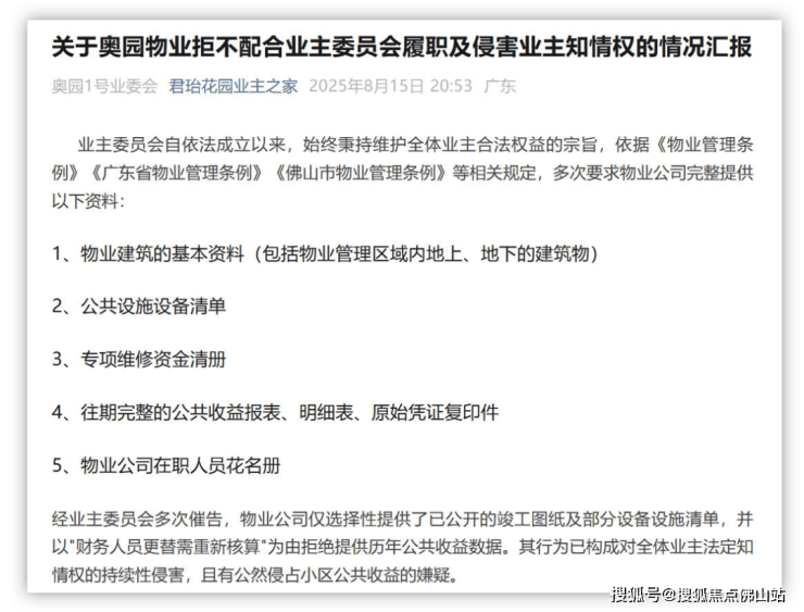 如奥园1号业委会控诉该物业长期拒不公示小区公共收益,并向法院提起诉讼。