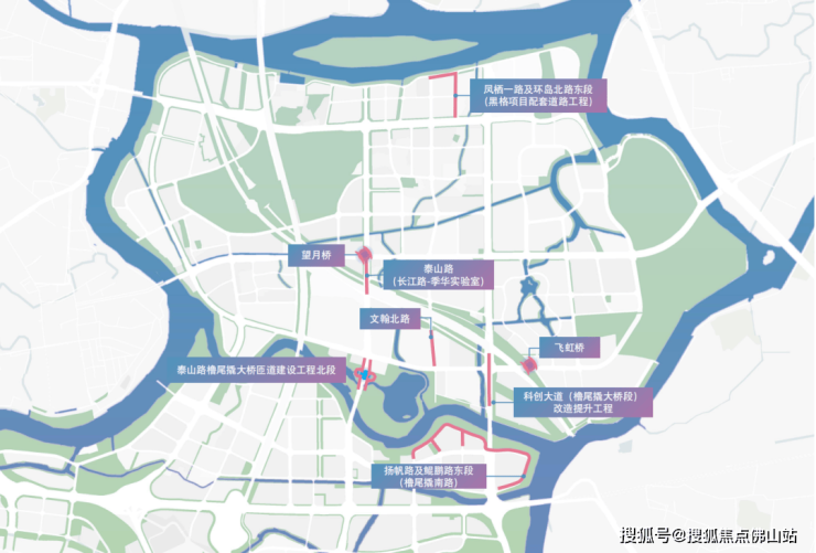 当日,泰山路(长江路-季华实验室)、扬帆路及鲲鹏路东段(橹尾撬南路)、文翰北路、凤栖一路及环岛北路东段(黑格项目配套道路工程)、泰山路橹尾撬大桥匝道建设工程北段、科创大道(橹尾撬大桥段)改造提升工程6条道路与望月桥、飞虹桥正式投用。
