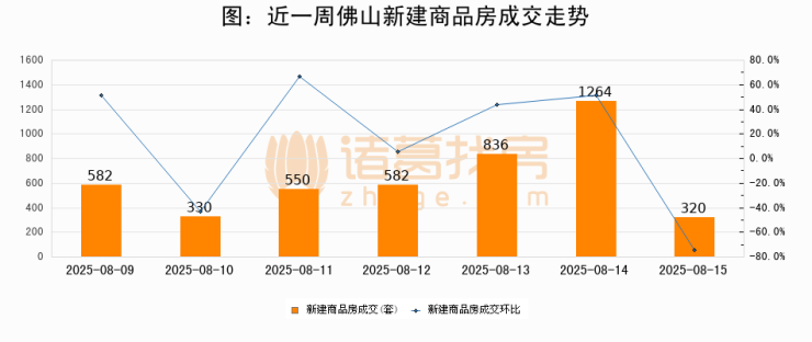 根据佛山市住房保障和房产信息网数据显示,2025年08月15日佛山新建商品房成交320套,较昨日减少944套,环比下降74.7%