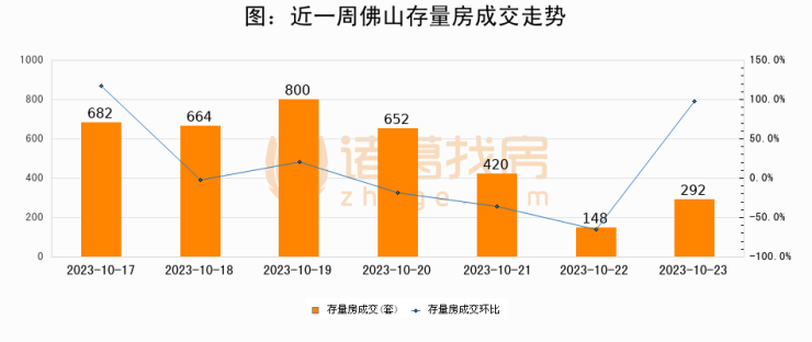 从存量房来看,2023年10月23日佛山存量房单日成交292套,比昨日增加144套,环比上涨97.3%。从近一周存量房成交来看,佛山存量房日均成交套数为522套,10月23日单日成交292套,低于近一周平均水平44.1%。