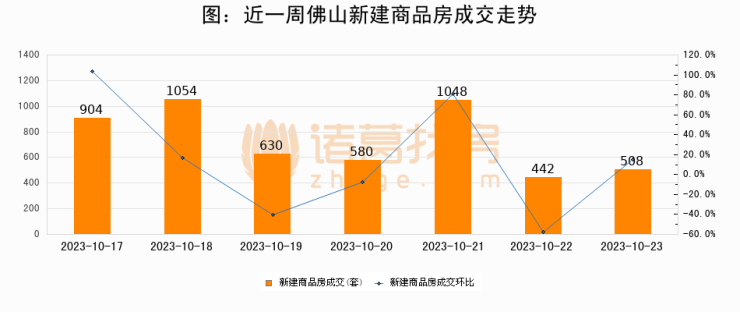 根据佛山市住房保障和房产信息网数据显示,2023年10月23日佛山新建商品房成交508套,较昨日增加66套,环比上涨14.9%