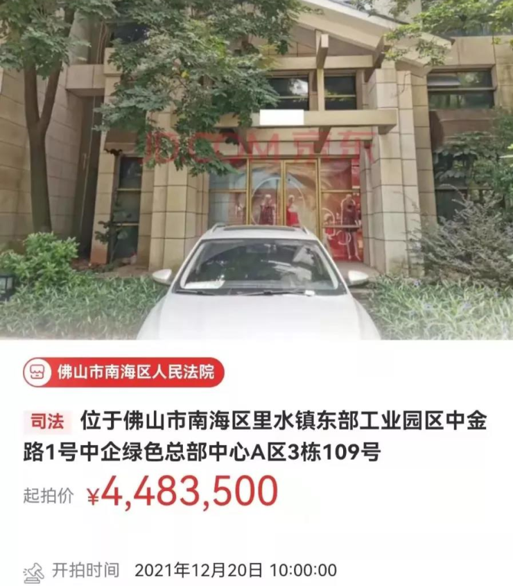 位于佛山市南海区里水镇东部工业园区中金路1号中企绿色总部中心A区3栋109号,房屋用途为工业、交通、仓储用房,建筑面积为1067.43平方米,套内建筑面积为858.17平方米,起拍价448.35万元,评估价640.5万元。