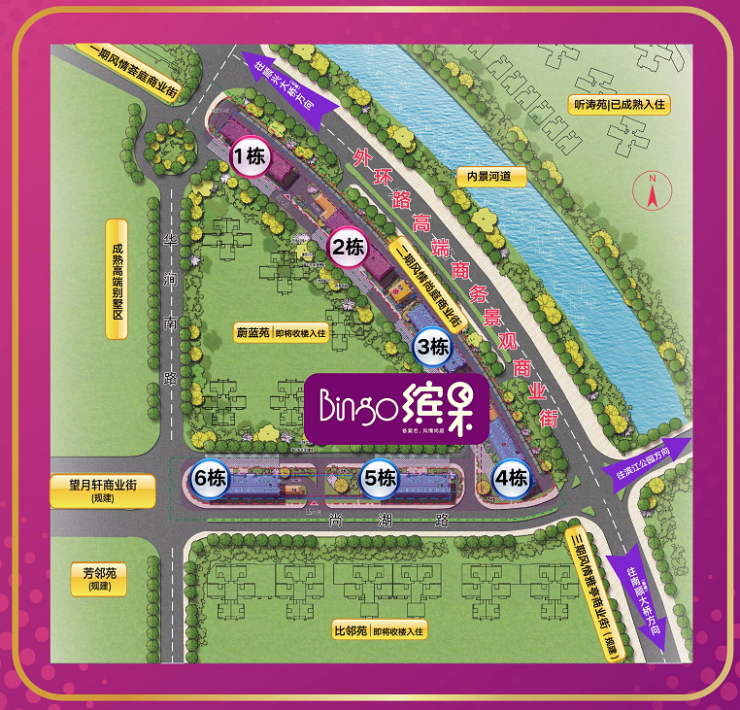 东临风情商业街,西拥成熟墅群景,北望宽阔内河景观