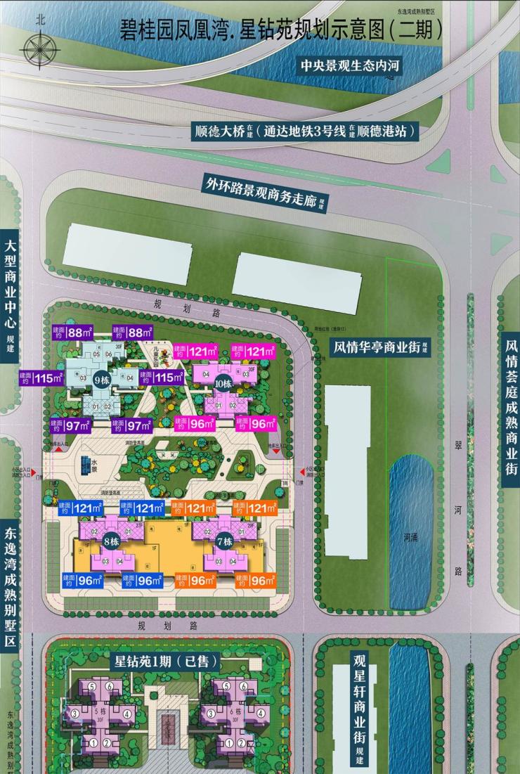 凤凰湾南大门滨水生活组团【阳光里2期】(备案名凤怡苑)两梯六户/两梯四户,约89㎡四口之家,带装修,总价108万起;