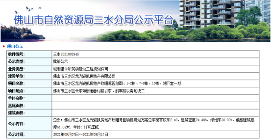近日,佛山市自然资源局三水分局公示了佛山市三水区龙光骏凯房地产有限公司申报龙玖曜湾园总平面规划方案和1-2栋、7-8栋、10栋、地下室一期项目建设工程规划许可批前公示,这意味着龙光三水新城首盘规划出炉,备案名为龙玖曜湾园!