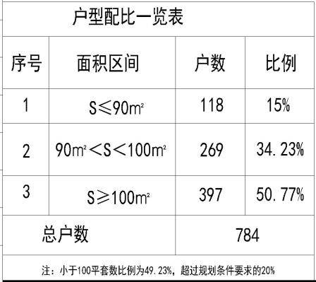 值得注意的是,根据项目户型配比表可知,面积≤90㎡,有118户,占15%;面积>90且<100㎡,有269户,占34.23%;面积≥100㎡,有397户,占50.77%。