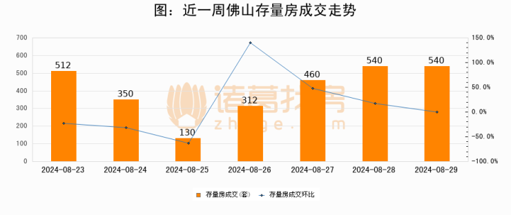 从存量房来看,2024年08月29日佛山存量房单日成交540套,比昨日持平。。从近一周存量房成交来看,佛山存量房日均成交套数为406套,08月29日单日成交540套,高于近一周平均水平33%。