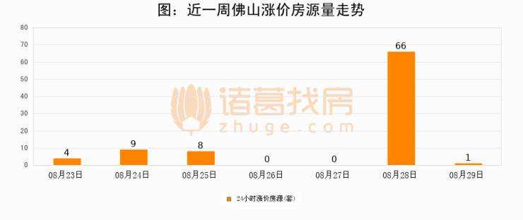 根据诸葛找房数据显示,佛山24小时涨价房源量为1套,较08月28日减少65套,环比下降98.5%。与此同时,涨价房源占比小幅回落,对于购房者来说是一个入市窗口期,购房者可抓住时机入市。