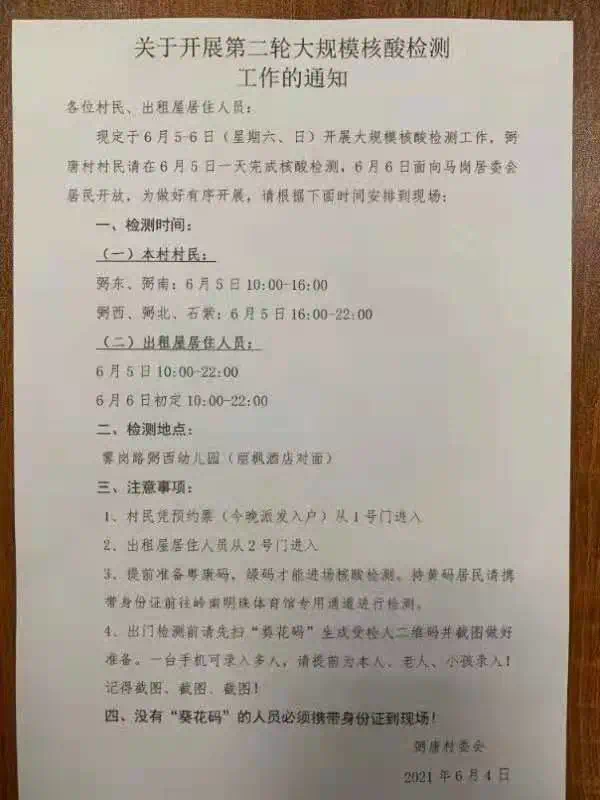 弼唐村委会提前一晚下发关于第二轮核酸检测时间的通知,通知村民及外籍人员于6月5-6日 10点至22点到雾岗路弼西幼儿园(丽枫酒店对面)进行核酸检测。
