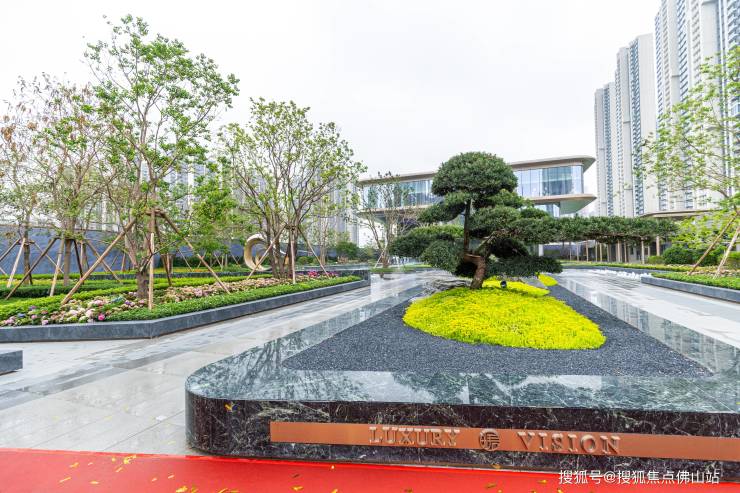 入口形象景墙承袭岭南照壁智慧,藏风纳气,彰显顺德世家“内外有序”的门风;两株迎客松成双而立,寓意“双喜盈门、福禄双至”,这是是珺璟对业主家人的第一份祝福。循步道前行,水景深处“林深见鹿”雕塑静卧,寄托福禄寿喜之愿,两侧静水景呼应“以水为财”传统,寓意聚财纳福、家宅安宁。