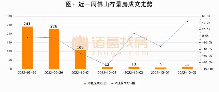 从存量房来看,2022年10月05日佛山存量房单日成交13套,比昨日增加4套,环比上涨44.4%。从近一周存量房成交来看,佛山存量房日均成交套数为89套,其中09月29日成交量较高为241套,10月05日单日成交13套,低于近一周平均水平85.4%。
