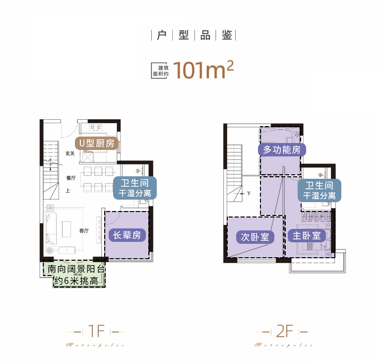 据悉,建面约101㎡复式户型,6米层高阔绰空间,上下两层,楼上极舒寝卧,楼下奢阔客厅,百变生活互不打扰。
