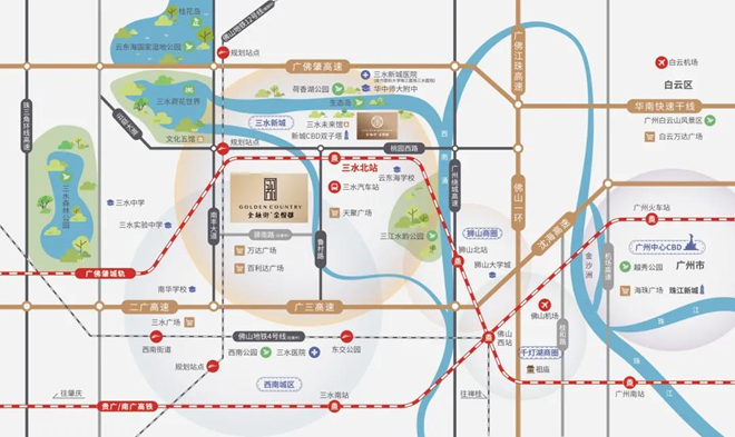 金融街·金悦郡位于三水新城TOD核心,坐拥广佛肇轻轨三水首站,另有“4高速+2地铁+1有轨电车+1汽车站”加持,多维立体交通贯穿大湾区各处,让居住在这里的人真正实现工作自由、生活自由,为品质人生添砖加瓦。