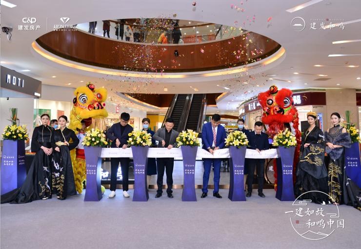 恰如千年国风与时代的交融,展厅现场,东方屋檐、月洞门等呈现出记忆中的家国印象。伴随一场激昂的醒狮表演,建发房产领导依次登台点睛,与在场的来宾、媒体一起,见证建发和鸣新中式美学展厅荣耀启封。