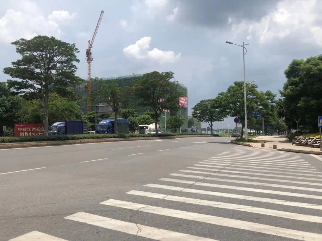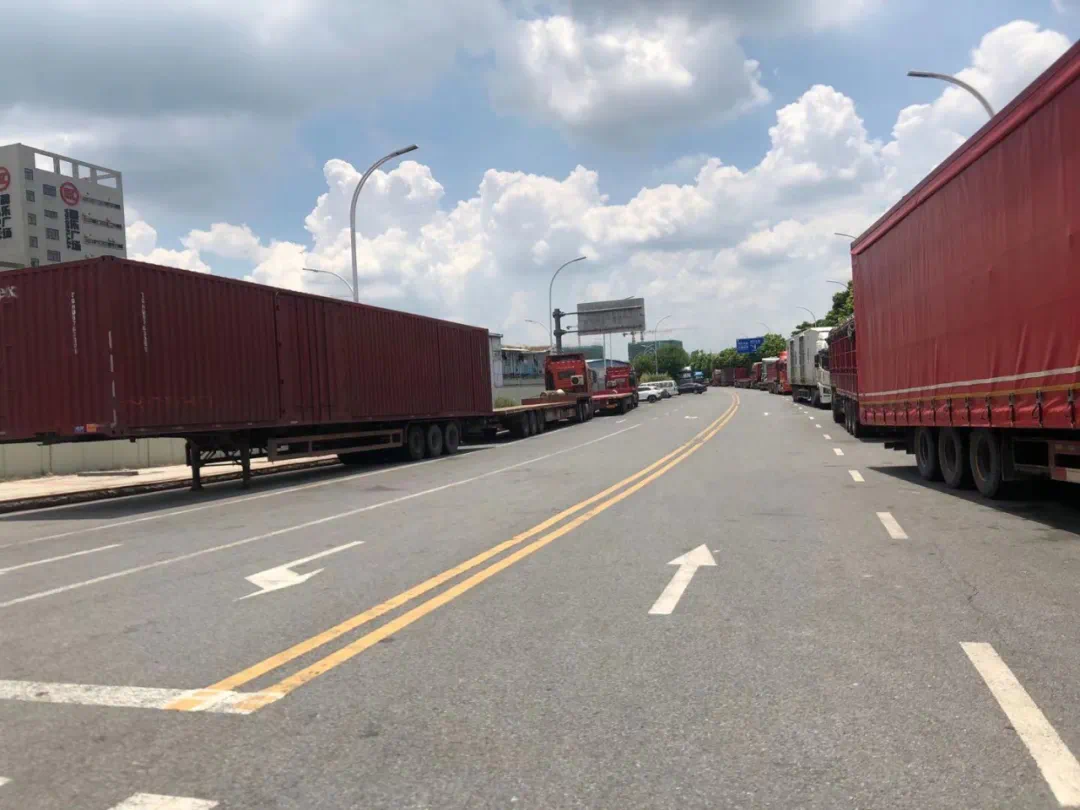 而前往天佑城途中,房谈君发现项目周边不时有各种货车往来,其中一条道路还停满集装箱、货车等。