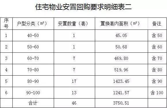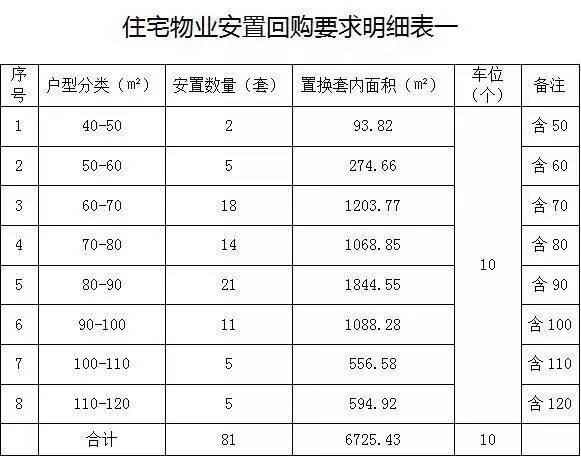 根据《住宅物业安置回购要求明细表》显示,项目须提供40-120㎡的合计127套房用于回购,其中81套的回购价格为7000元/㎡,而另外46套的回购价格为10735元/㎡,车位价格15万/个。