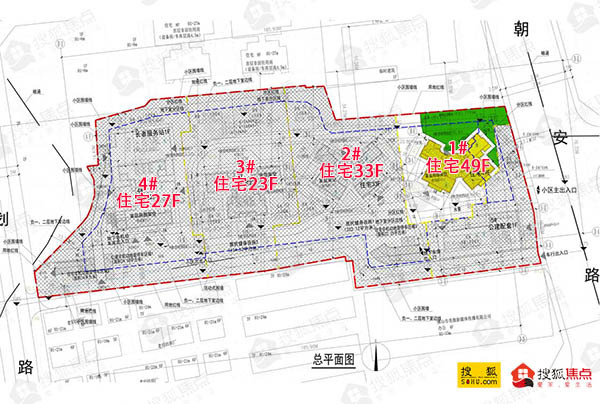 从披露的建筑工程规划图上可以看出,项目共规划了4栋住宅,由东到西一字排开,分别为1号/2号/3号/4号楼,楼高分别为49层、33层、23层、27层。