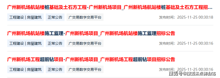 11月25日,广州新机场发布三项工程的招标公告 涉及航站楼土石方工程、施工监理、超前钻项目。