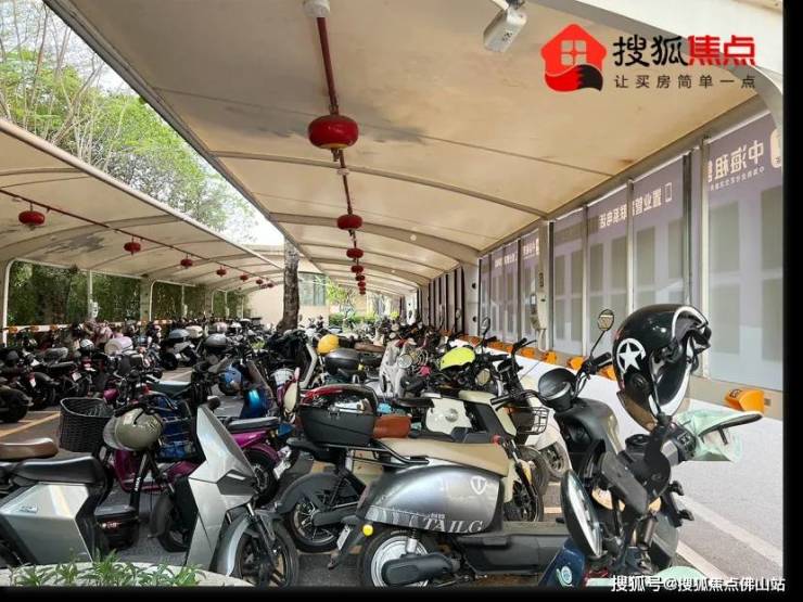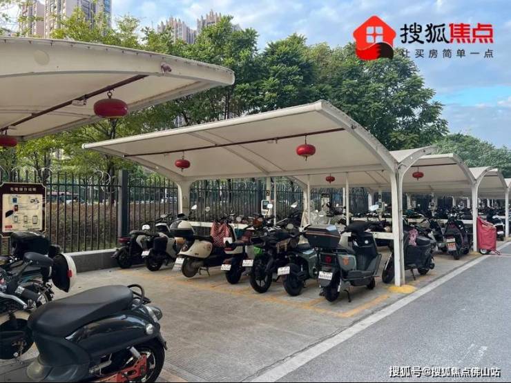 中海万锦豪园的门外设置了非机动车停放点,另外在小区入口处比较近的位置,也设有充电棚。