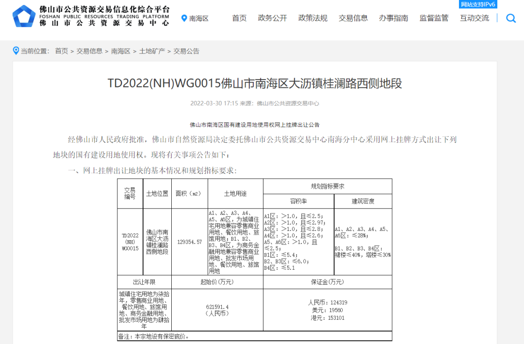 今日,搜狐焦点佛山站从佛山市公共资源交易中心获悉,位于南海大沥镇桂澜路西侧地段的聚豪村巨无霸商住地正式挂牌!地块起拍价超62亿,折合起拍楼面价约14976.48元/㎡,拟将于4月29日15时进行网拍!